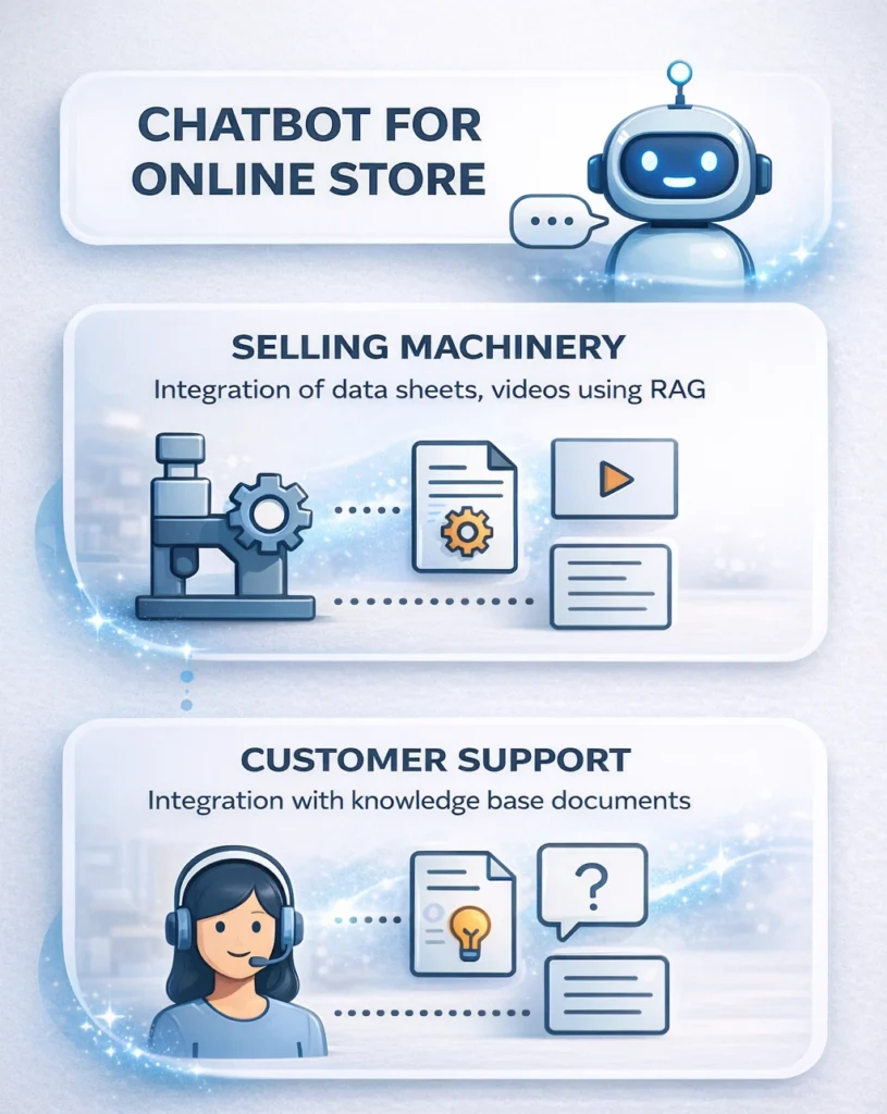 - Build a RAG (Retrieval Augmented Generation) based chatbot to provide real time online support to sales enquiries, by integration of customer specific data (machinery data sheets, videos, other information)